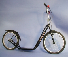 Celohliníková koloběžka s 20" koly. Páteřová rámová trubka průměr 48mm. Použitelná délka stupačky 380 mm. Přední a zadní "V" brzda. Nosnost do 100 kg. Výška říditka nad zemí 1100 mm. Délka:1330cm Světlost nad vozovkou:60mm Doplňky: zvonek,opěrný stojánek Cena: CZK 3120,- Váha: 7.5 kg Product variants s odpruženou vidlicí